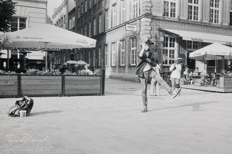 There was a sizeable crowd forming around a group of three performers. This photo was captured while they were still warming up before their show. It's one of very few street photographs of mine that I consider good. The subject occupies the very centre of the frame, and the depth of field is shallow enough to provide a clear separation from the background, but while leaving in a ton of context - enough to precisely locate the scene.