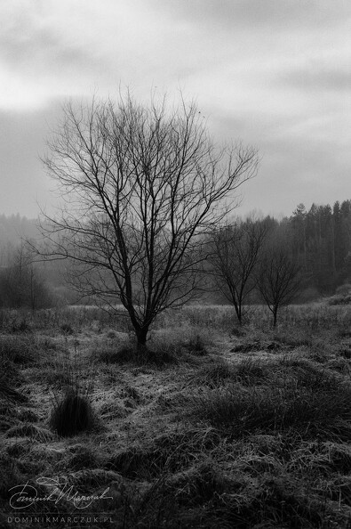 A tall deciduous tree in the middle of a meadow, with a much smaller, younger companion on the right. The distant forest is obscured by fog. Tricity Landscape Park, Gdańsk, Poland.
