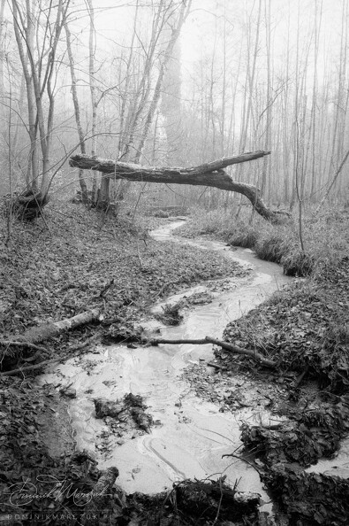 A small tree with bare branches stands next to a narrow, winding stream in the middle of a meadow. The background is obscured by fog. Tricity Landscape Park, Gdańsk, Poland.